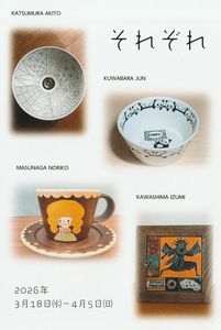 埼玉県坂戸市の「うつわ坂」では、3/18~4/5まで、同県で作陶されている4人の作家さんの作品をあつめた『それぞれ』が開催されます。細やかさとおもしろさ、かわいらしさとおおらかさ、4人それぞれの個性があふれる作品が、多数展示販売される個展です。
